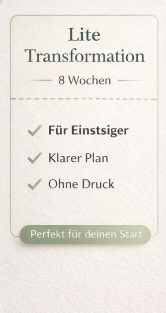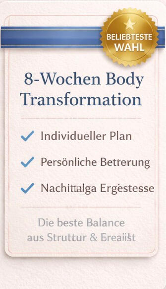 Ich arbeite mit Frauen, die nachhaltig abnehmen wollen – ohne extreme Diäten oder kurzfristige Lösungen.Mein Ansatz basiert auf klarer Struktur, individuellen Strategien und einem System, das sich in deinen Alltag integrieren lässt.Mit meinem 8-Wochen Body Transformation Programm begleite ich dich durch den gesamten Prozess – Training, Ernährung und Gewohnheiten.Keine Diät.