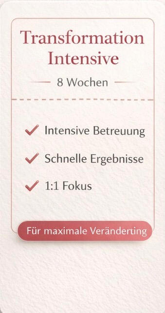 Um die Qualität meiner Betreuung zu gewährleisten, arbeite ich nur mit einer begrenzten Anzahl an Frauen gleichzeitig.Wenn du starten möchtest, sichere dir jetzt deinen Platz.